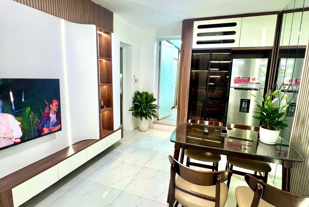 + Nội thất hiện đại trang bị đầy đủ: tivi, tủ lạnh, máy giặt, bếp từ, điều hòa, giường tủ, bàn ghế, cửa từ….