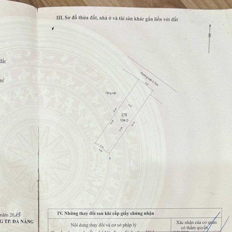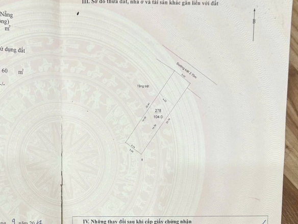 -Diện tích đất 104m2, ngang 5m, sổ đẹp vuông vức.