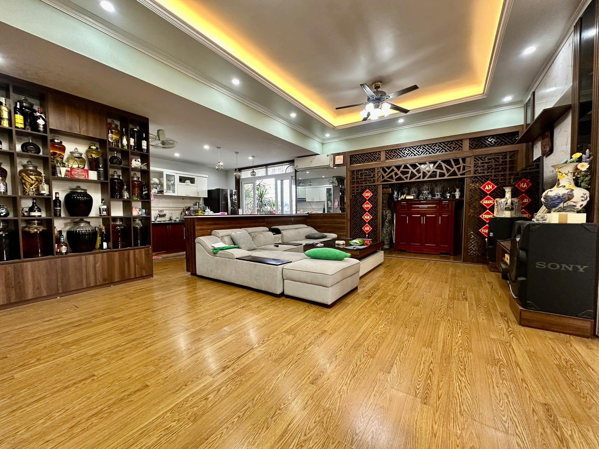 Phòng khách siêu rá»™ng nối liá»n khu bếp, thiết kế hiện đại – sang trá»ng