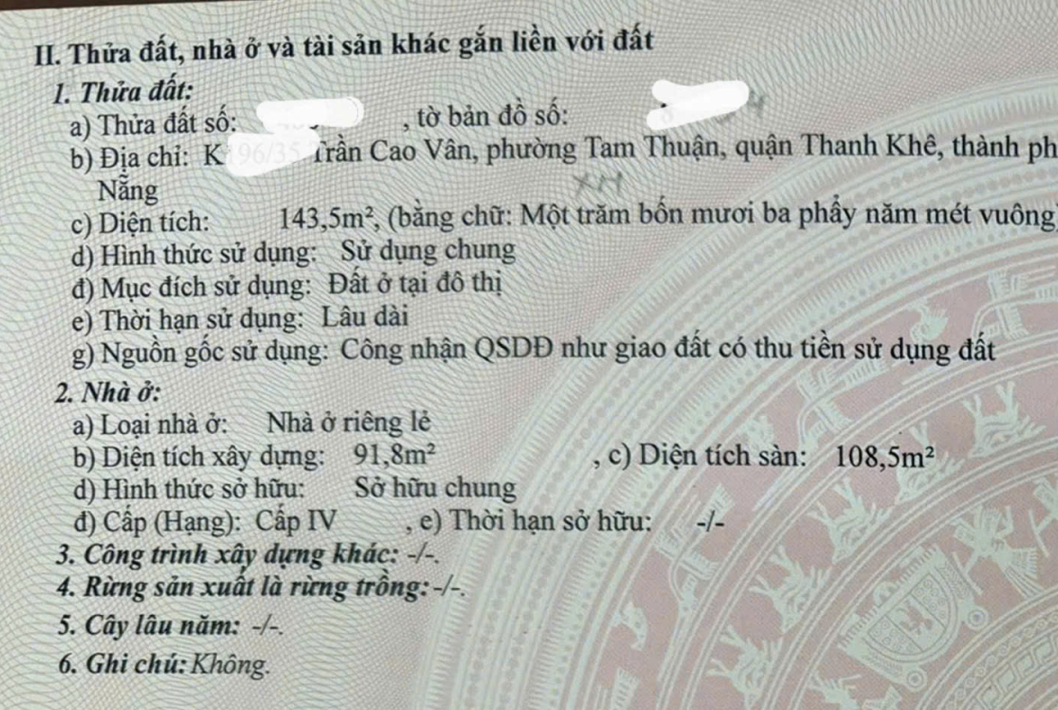 – Diện tích: 143,5m² (ngang 6,15m – nở hậu 6,32m)