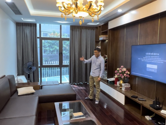 Nhà có diện tích 115m, mặt tiền 4,2m, xây 5 tầng khung cột chắc chắn, nội thất xịn xò, thang máy nhập khẩu, 2 xe ô tô 7 chỗ vào nhà.