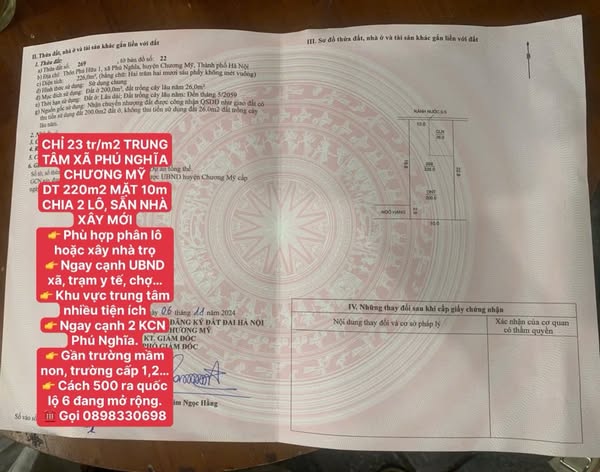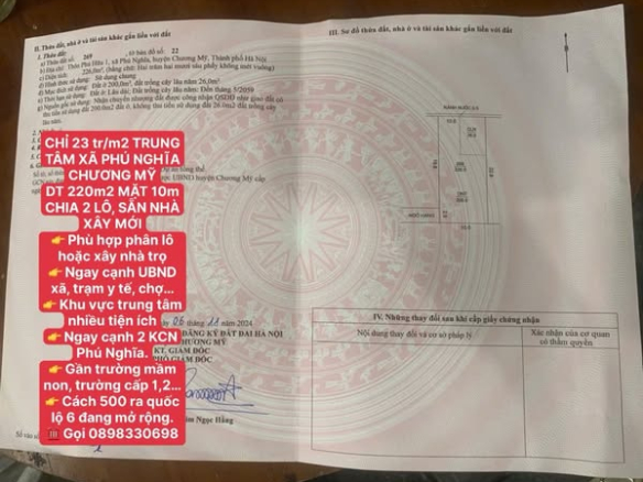 23 tr/m2 TRUNG TÂM XÃ PHÚ NGHĨA CHƯƠNG MỸ DT 220m2 MẶT 10m CHIA 2 LÔ, SẴN NHÀ XÂY MỚI