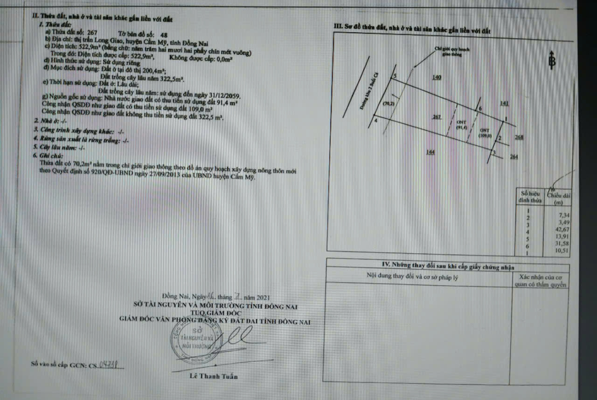 * Tổng diện tích đất 444m2 ( 13,6m x 36m) có sẳn 200m2 đất thổ cư. Đất tọa lạc tại trung tâm của Thị trấn Long Giao, huyện Cẩm Mỹ, tỉnh Đồng Nai .Mã số: 2LG-07