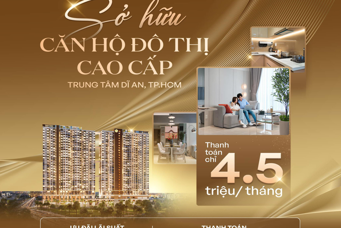 Với phương thức thanh toán đột phá, mỗi tháng chỉ 4,5 triệu, bạn sẽ là chủ nhân của căn hộ hiện đại đúng gu, ngay cửa ngõ TP.HCM mở rộng, gần tuyến Metro số 1.