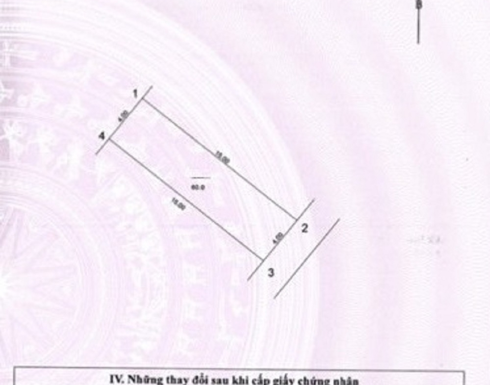 Diện tích 62m2. Mặt tiền 4m sâu 15m, khuôn đất vuông như tờ A4.