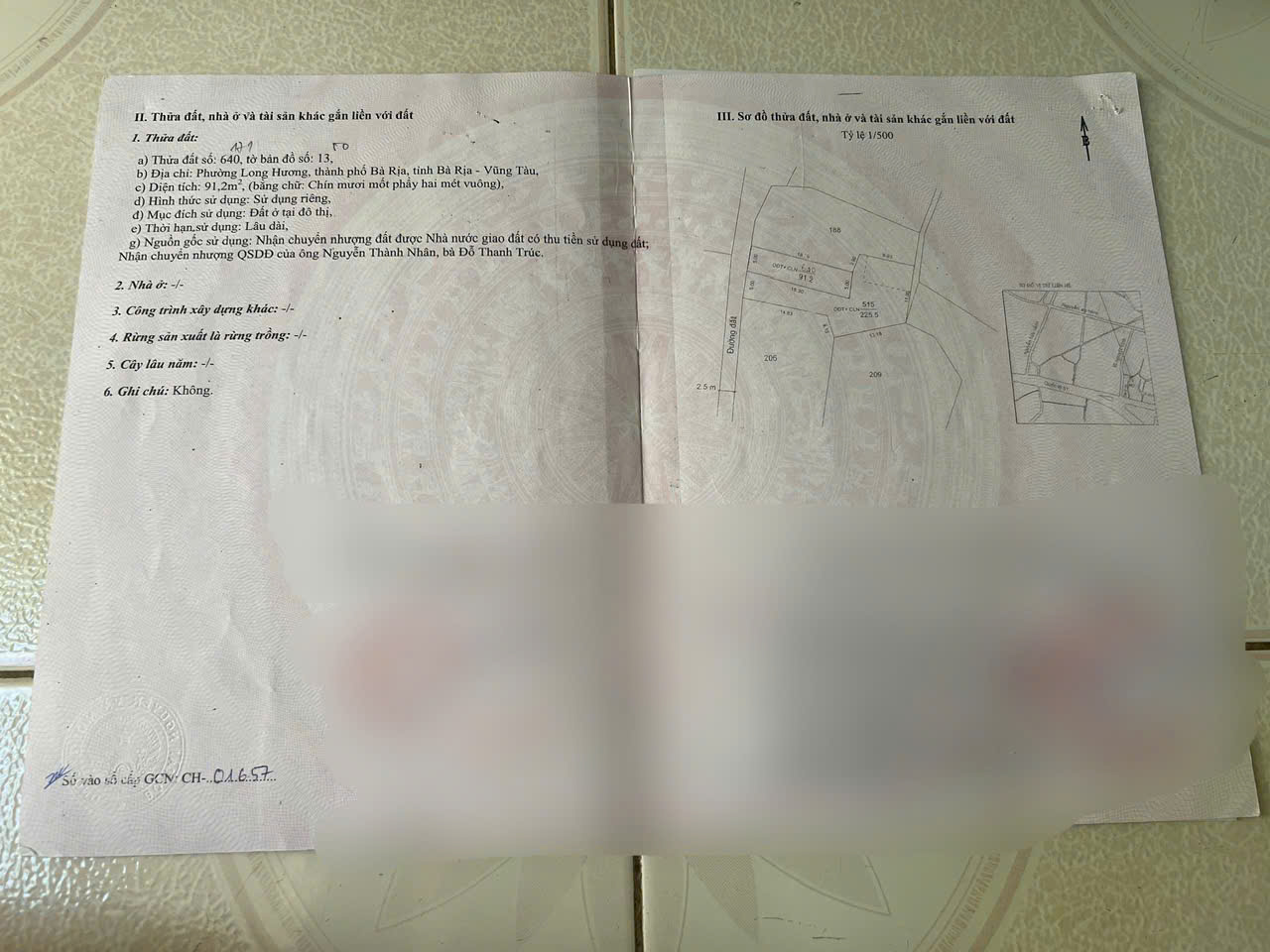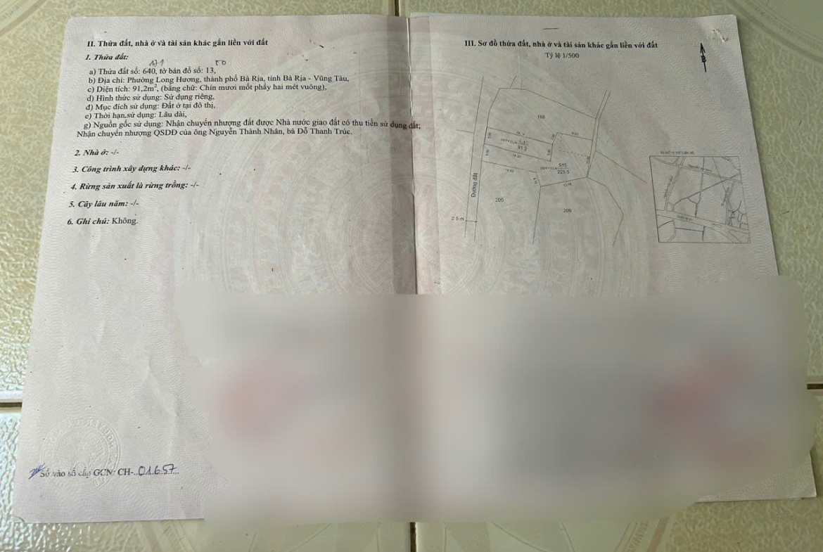 Bán 91,2m2 Đất Thổ Cư Chính Chủ Ngay Trung Tâm Phường Long Hương, TP. Bà Rịa, Bà Rịa Vũng Tàu.
