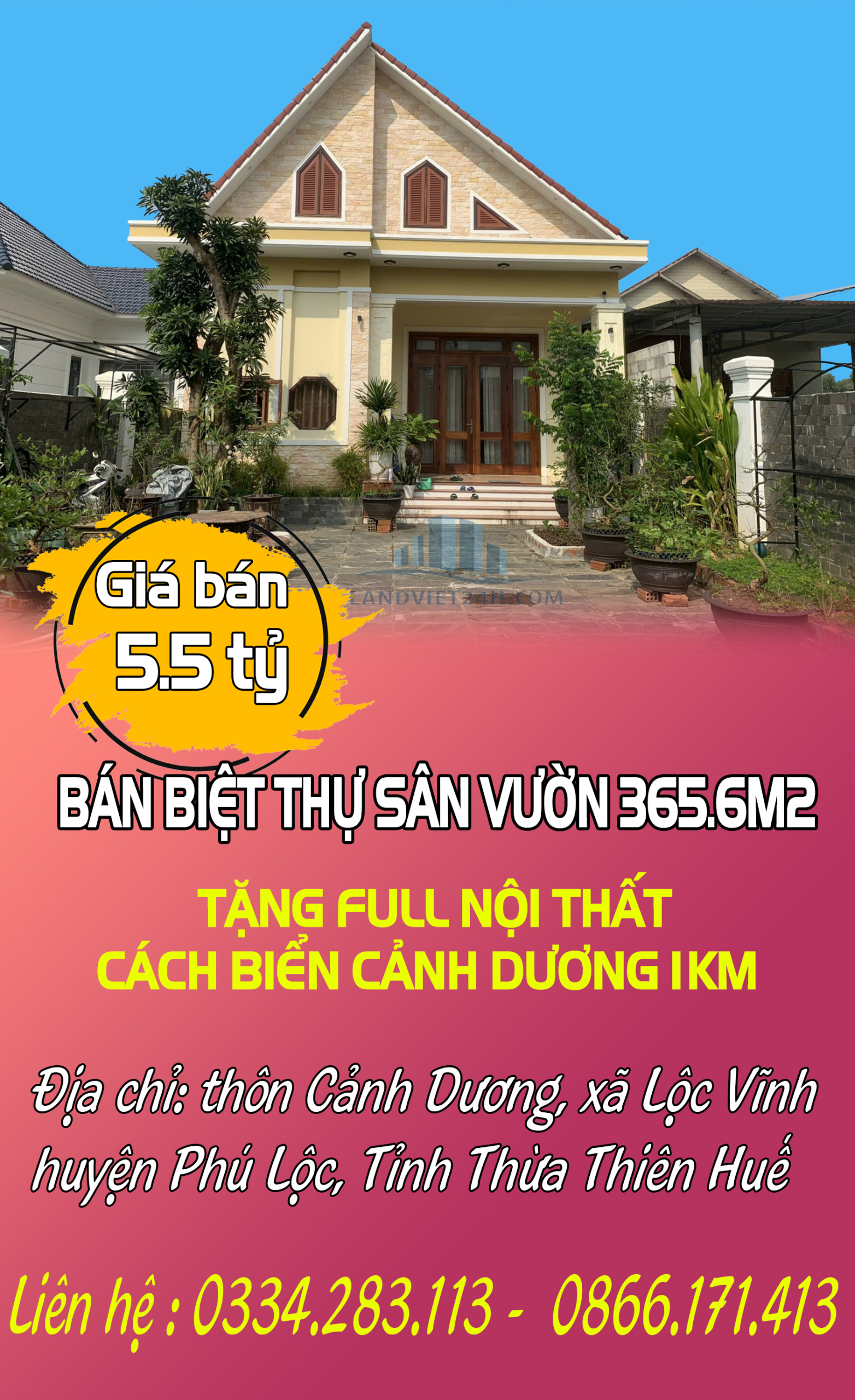BÁN BIỆT THỰ SÂN VƯỜN 365.6M2 TẶNG FULL NỘI THẤT CÁCH BIỂN CẢNH DƯƠNG 1KM
