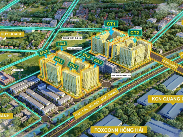 – Nằm giữa 4 KCN: Quang Châu, Vân Trung, Đình Trám, Song Khê Nội Hoàng. Bên cạnh Cao tốc Hà Nội – Lạng Sơn.