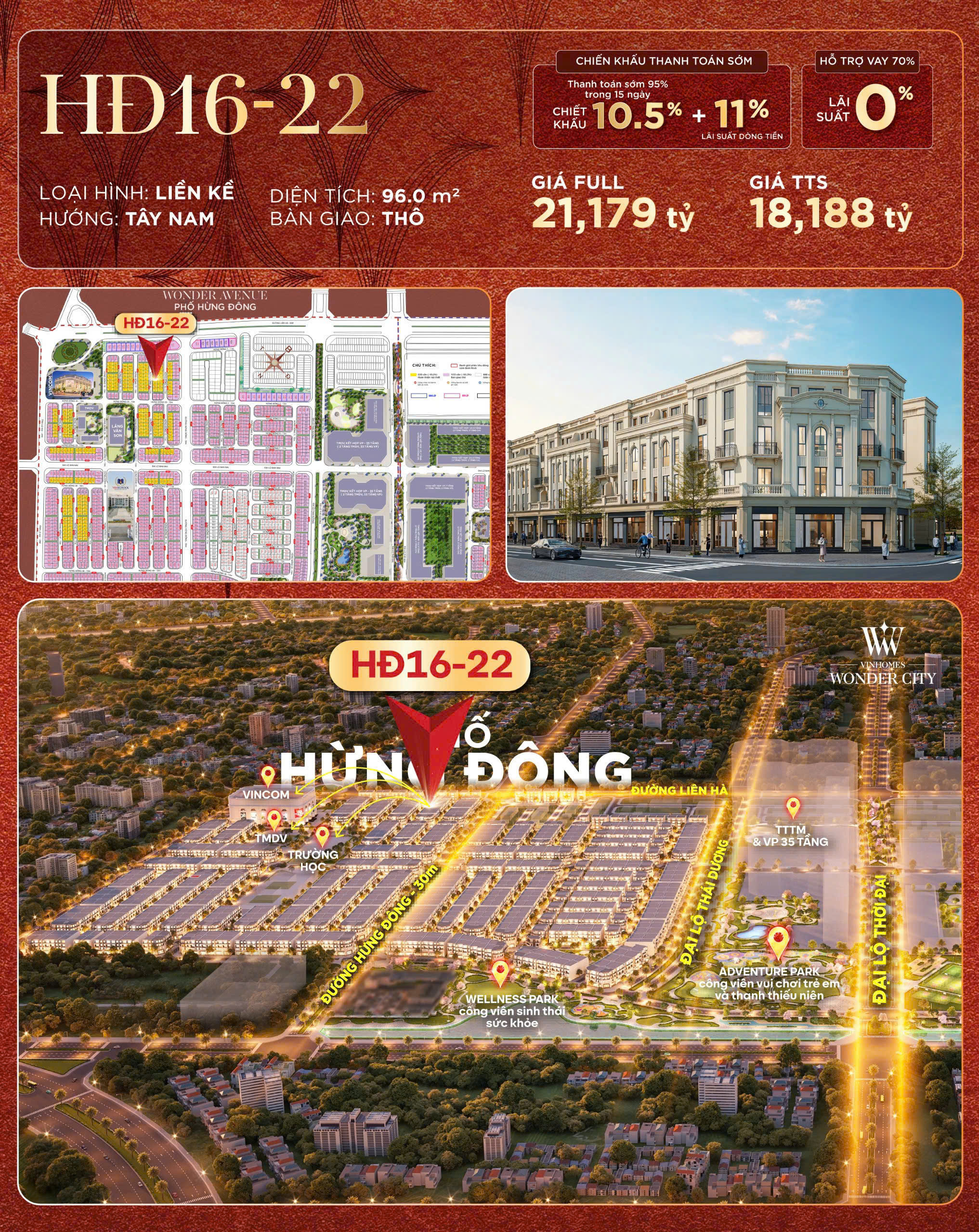 Bán căn Hừng Đông16-22, 96m² Vinhomes Đan Phượng – Giá chỉ 18.188 tỷ – Cạnh Vincom, vị trí đẹp hướng Tây Nam