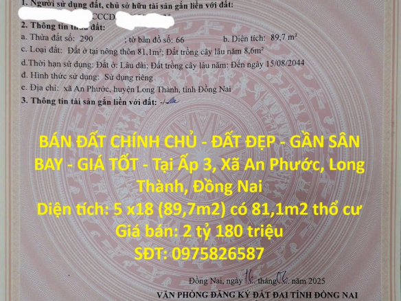 BÁN ĐẤT CHÍNH CHỦ – ĐẤT ĐẸP – GẦN SÂN BAY – GIÁ TỐT – Tại khu trung tâm Long Thành, Đồng Nai.