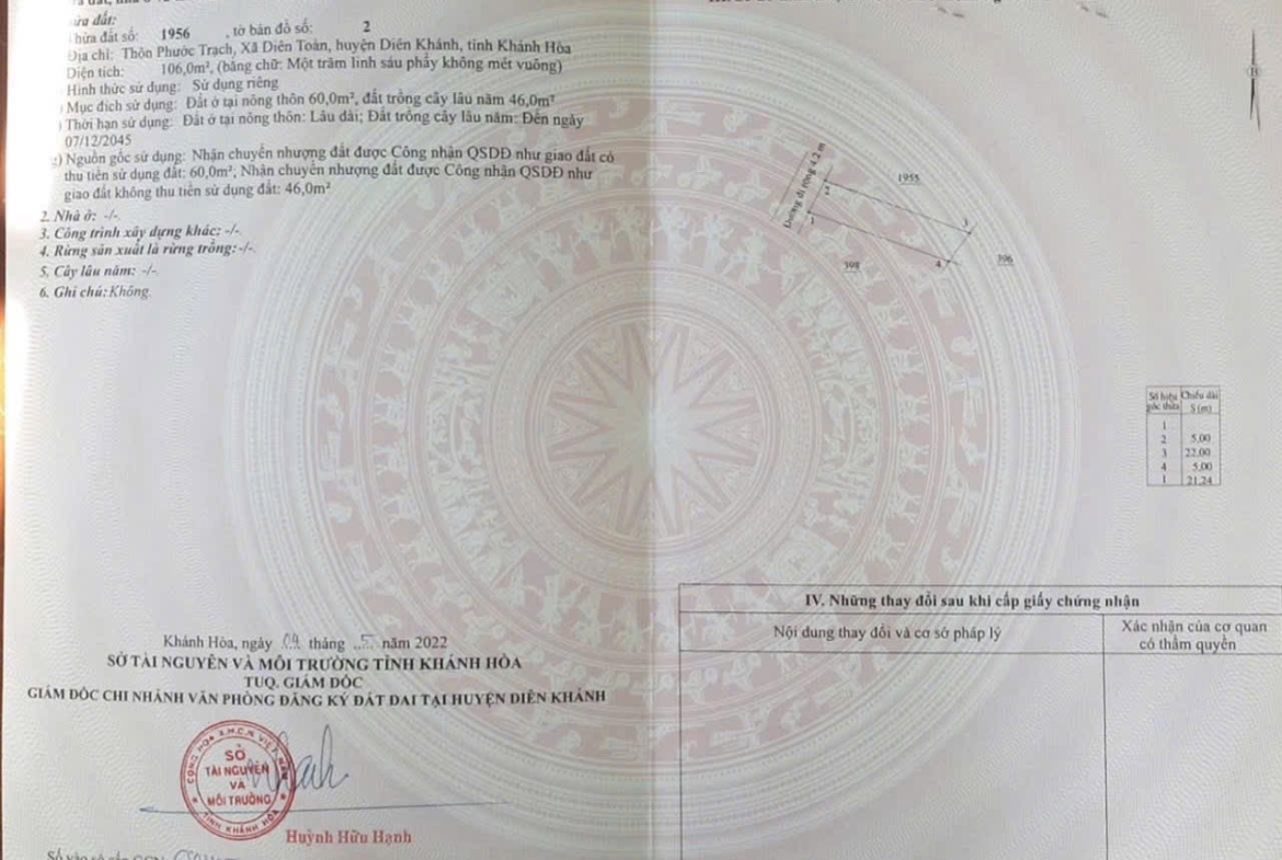 👉 DT: 106 mét. (60 Thổ cư) còn lại cây hằng năm. Ngang 5m.
