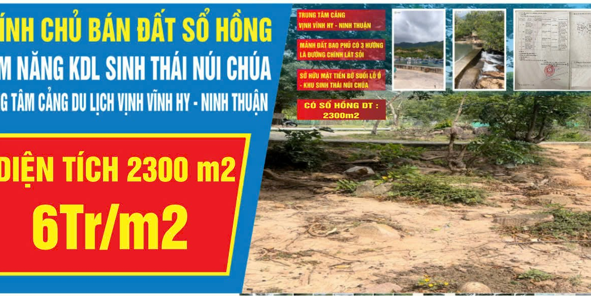ĐẤT TIỀM NĂNG KINH DOANH DU LỊCH SINH THÁI KHU ĐẤT TIỀM NĂNG LÀM KHU DU LỊCH SINH THÁI LÀNG DÂN TỘC Vị trí đất : đường xe ô tô , cách Resort Amanoi 3 km , cách cảng biển vịnh Vĩnh Hy 1 km. cạnh bờ suối Lồ Ồ – du lịch Cầu Gãy làng dân tộc Raglai Giá bán : 06 triệu /1m2. Tổng diện tích : 3.000 m2 , có 2.300 m2 trong sổ hồng và đang làm sổ : 700 m2. Liên hệ chính chủ sở hữu : HUỆ CHÂU PHƯƠNG (0869993648) (Tôi rất muốn chia sẻ những gì tôi đang có trong cuộc sống này đến với trẻ em mồ côi cần được giúp đỡ từ tinh thần đến việc cần nhất trong cuộc sống của các bạn mà tôi có hữu duyên được gặp , nên tôi muốn bán tài sản tôi đang có để có đều kiện hướng đến các bạn nhỏ, mong hữu duyên gặp được người khách trợ duyên cho công tác ý nghĩa này ) Đặc biệt : UBND đã có thông báo quy hoạch thành đất thổ cư cho dân làng tái định cư, quy hoạch thành làng du lịch sinh thái dân tộc Raglai năm 2024. Khu đất có vị trí rất đẹp, hướng vào từ cây cầu treo bằng gỗ Cầu Gãy ( du lịch Cầu Gãy ) đến suối Lồ Ồ, hiện tại đã có quy hoạch làm đường cho ô tô vào khu làng dân tộc Raglai nằm ở rìa vùng Núi Chúa, và có bãi giữ xe cho khách tham quan du lịch . Khu đất tiếp giáp cạnh của 3 mặt tiền đường làng và một cạnh ngay rìa bờ suối LỒ Ồ . Khách du lịch thường tham quan Suối và khi đi vào núi Chúa , khách thường đi ngang qua khu đất này . Khu đất có một mặt tiếp cạnh bờ Suối Lồ Ồ, một mặt hướng về Núi , địa thế rất đẹp , hữu tình, vì khu đất có địa thế mặt phẳng rộng và có cây to bao phủ bóng mát nên khách rất thích dừng chân tại đây để thụ hưởng không khí trong lành và nghe tiếng suối róc rách men theo triền đá bờ suối Lồ Ồ, Nếu khách tham quan thực địa, chỉ có khu đất này có vị trí đẹp nhất so với các mảnh đất khác, đặc biệt, khu đất có SỔ hồng, pháp lý rõ ràng. Khu đất cách trung tâm cảng Vĩnh Hy , vịnh Vĩnh Hy là một trong 10 vịnh đẹp nhất của Việt Nam, Trong bán kính gần 500 m, gần vườn Quốc gia Núi Chúa , vị trí khu đất : 1 mặt ngay cạnh suối Lồ Ồ, 2 mặt tiếp 2 cạnh đường vào làng, cách cảng biển gần 1 km . Có cảng biển , bờ kè biển đã xây dựng , đường giao thông du lịch . Khu đất đã xây dựng tường rào bờ bao bảo vệ ranh đất. Tiện ích khu đất này : là ngay trung tâm du lịch vịnh Vĩnh Hy , dịch vụ du lịch , kinh doanh nhà hàng , khách sạn , gần trường học , siêu thị , công viên , resort Vĩnh Hy , Resort AMaNoi. Khu vực thu hút đông đảo khách du lịch trong và ngoài nước tham quan quanh năm.