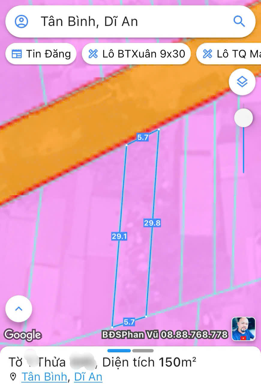 • Ngang 5,5m x Dài 29m = 150m², sổ riêng, thổ cư chuẩn..