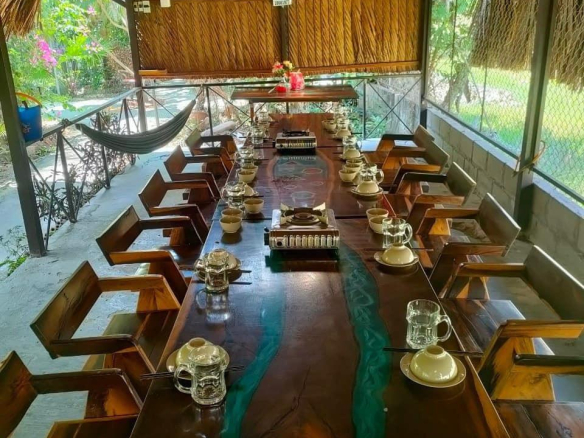 – Khu nhà lá tum tre bao quanh hồ cá- cây trái bao quanh