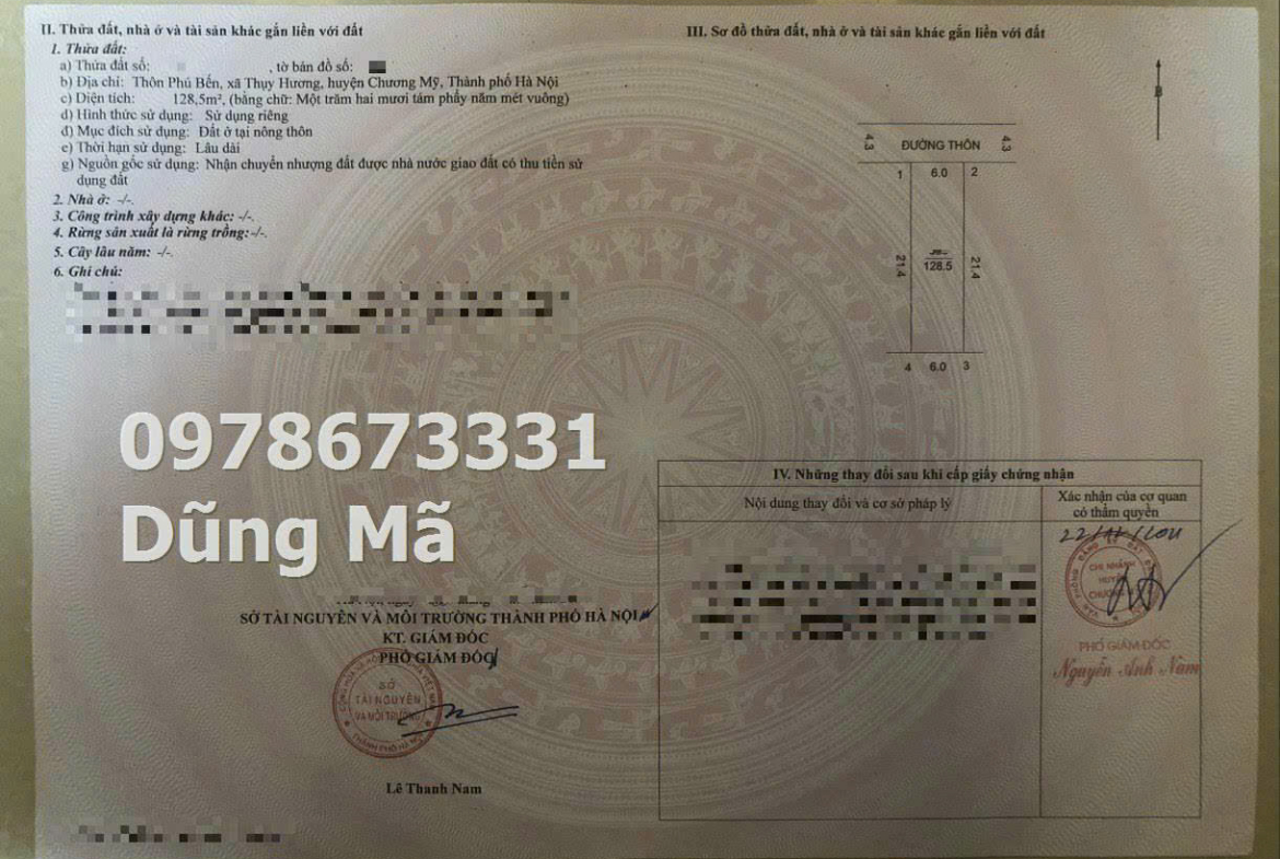 -Diện tích : 128,5m2 -Mặt tiền = mặt hậu = 6m vuông vắn -Đường trước đất rộng gần 5m ô tô chạy thông -Ngay gần trục chính kinh doanh thôn