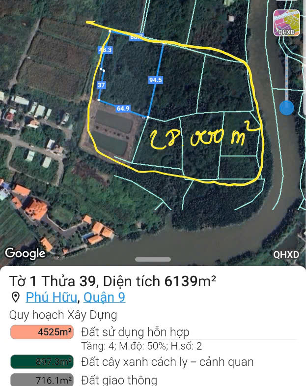 Bán Lô đất lớn tại mặt tiền sông rạch chiếc và dg nội bộ Bưng Ông Thoàn, Phú Hữu, Q.9 Thành Phố Thủ Đức. – chính chủ gửi bán lô đất tâm huyết giá Siêu rẻ – có một không hai dành cho các chủ đầu tư và cho các anh chị mua làm công ty, nhà xưởng, hoặc xây biệt thự đều được tại phường Phú Hữu, Quận 9 – Trong đó tổng diện 28.000m² là đất trồng cây lâu năm.) Rất thích hợp cho xây Biệt thự sang trọng, công ty, nhà xưởng …. – Chính chủ tiếp khách thiện chí, có tài chính thật sự. … tính ra chỉ 13tr/m2 quá rẻ,