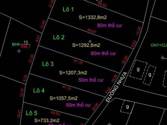 Diện tích là 20×64 nở hậu 21m. Diện tích tổng lô 1.332m2. Phủ hồng toàn bộ có 80m2 thổ cư.