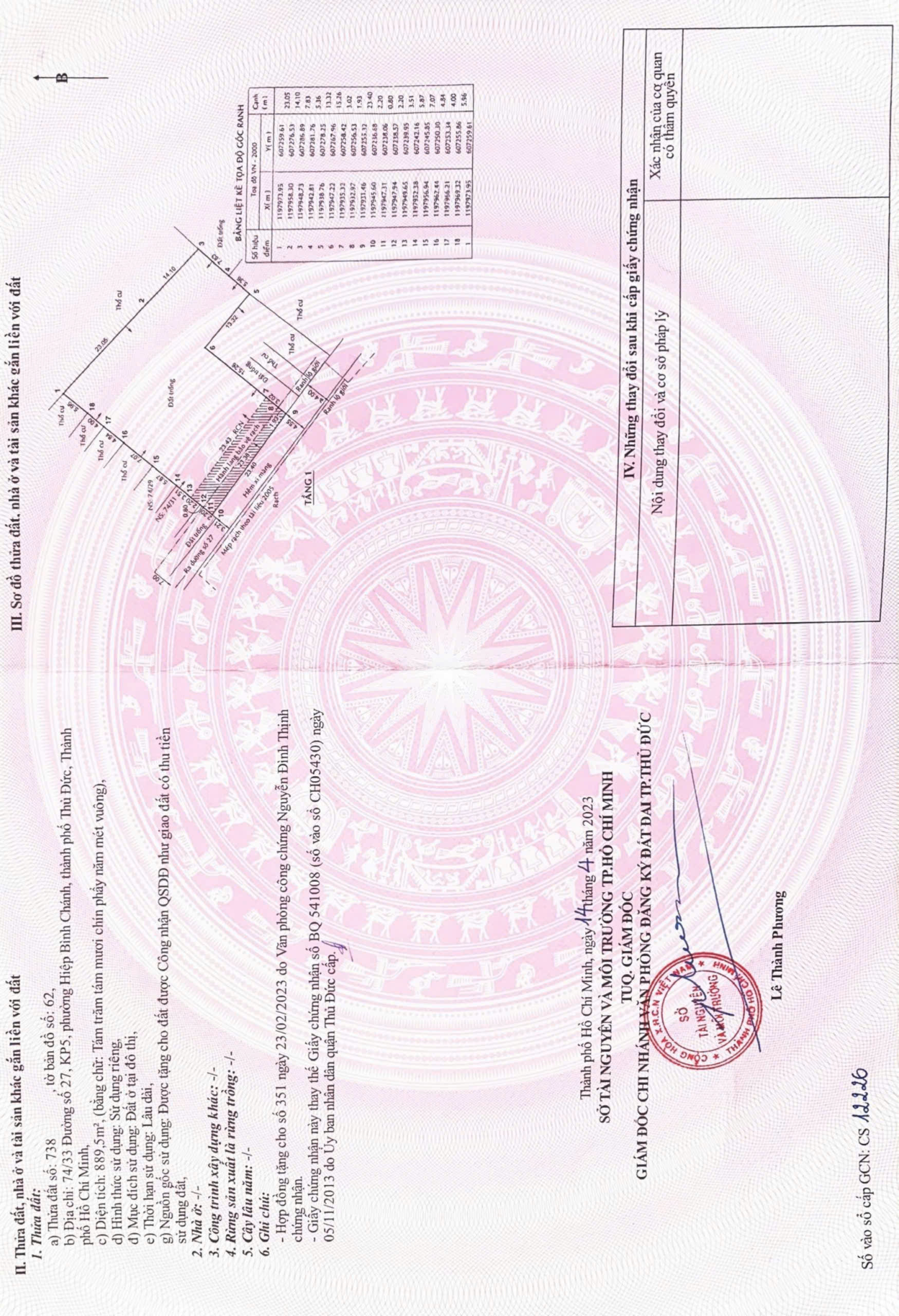 – Diện tích: 23.5x33m= 1015m, công nhận 895m full thổ cư, nở hậu 38m