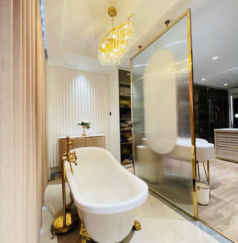 – phòng 3 được thiết kế 1 phòng thay đồ với hệ tủ dài 6 mét áp sát 2 bên vách + 1 bàn trang điểm + 1 tủ phụ kiện và được thiết kế 1 bồn tắm và tủ trang trí thiết kệ mà mạ đồng cao cấp tất cả đều được làm từ gỗ Công Ty An Cường