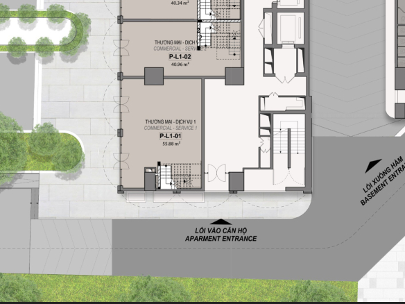 Lô 2 mặt tiền nằm trên trục Nguyễn Tất Thành và lối vào sảnh sau cùng lối xuống hầm để xe
