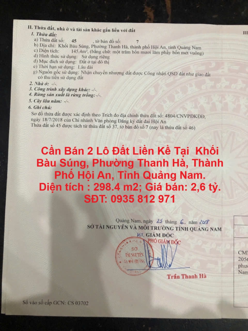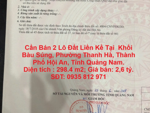 Cần Bán 2 Lô Đất Liền Kề Tại Khối Bàu Súng, Phường Thanh Hà, Thành Phố Hội An, Tỉnh Quảng Nam.
