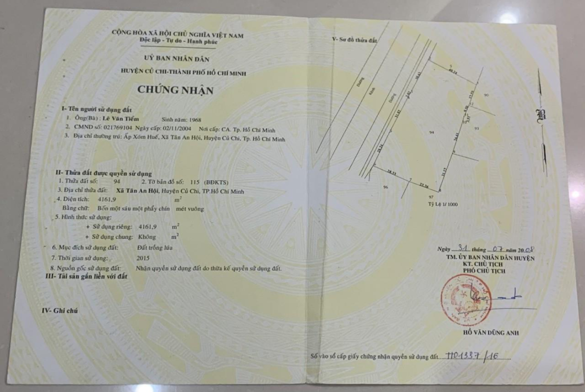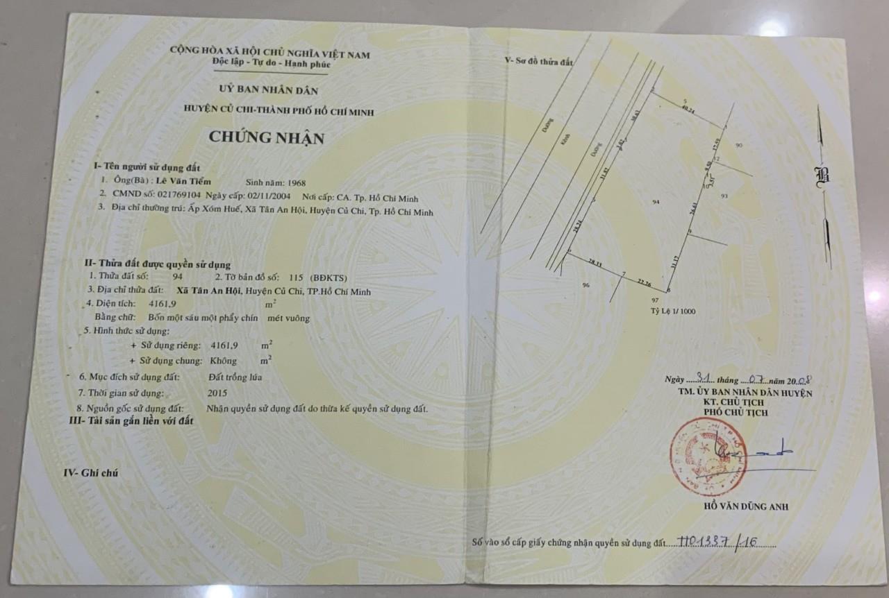 Cần bán gấp lô đất với tổng DT : 4161,9 m², tọa lạc tại ấp mũi lớn, xã tân an hội, củ chi – TPHcm,