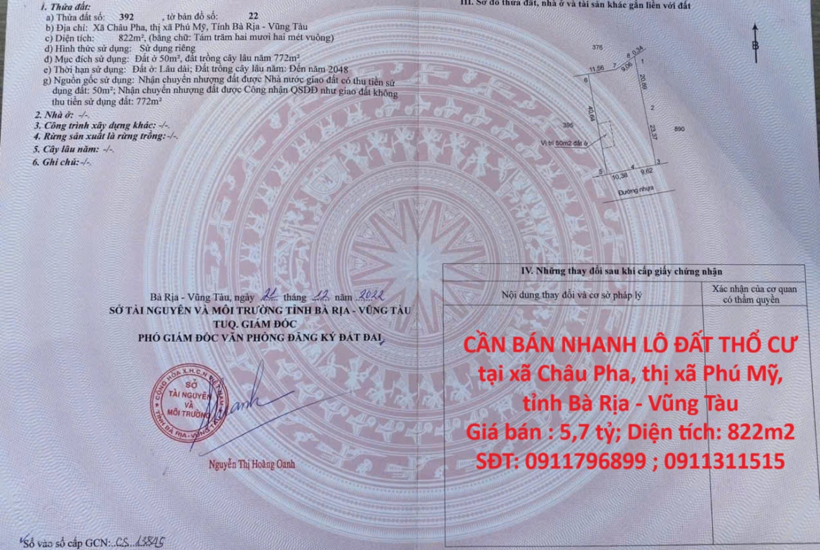 Diện tích: 822m2 (50m2 thổ cư)