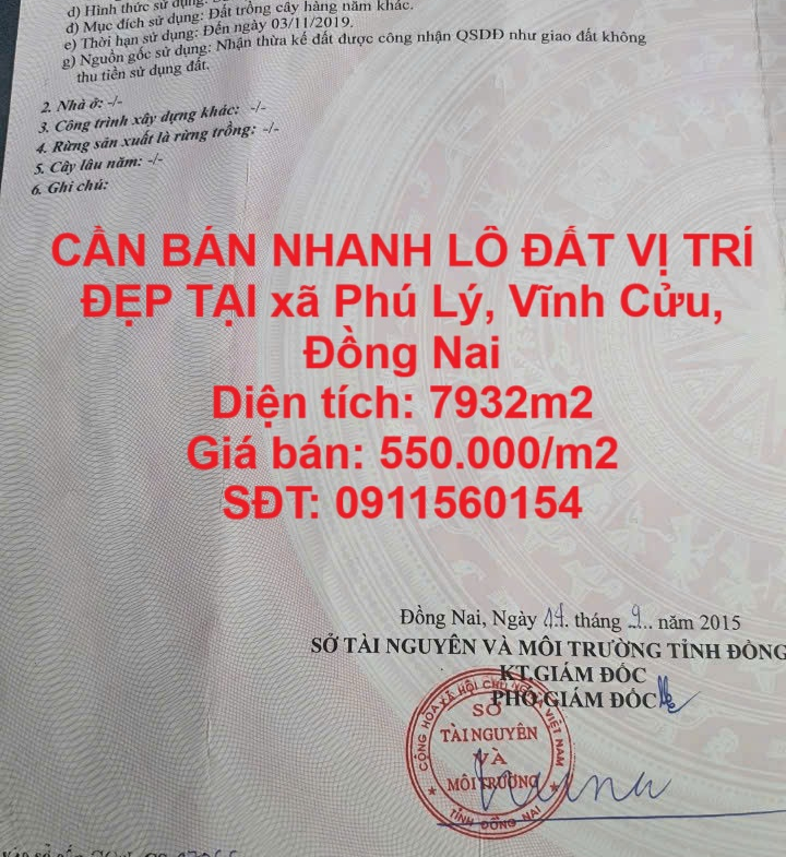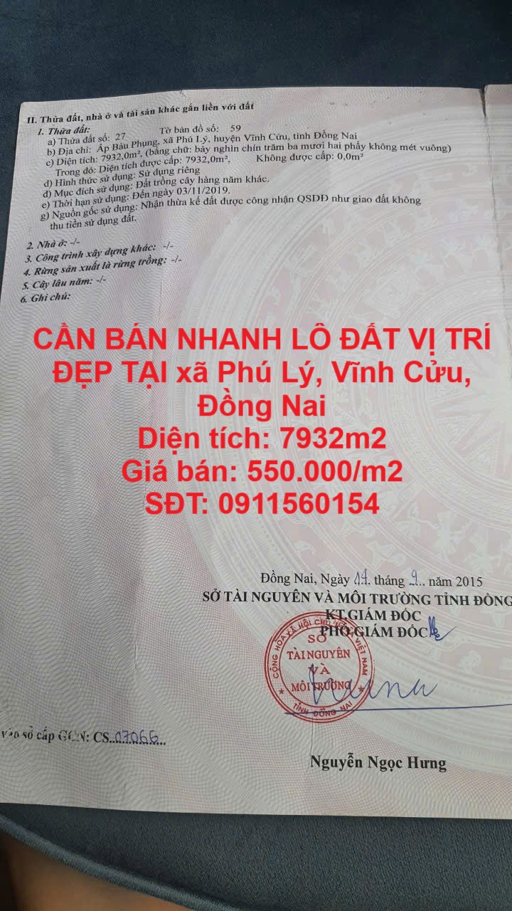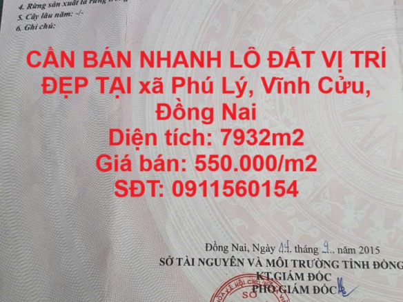 CẦN BÁN NHANH LÔ ĐẤT VỊ TRÍ ĐẸP TẠI xã Phú Lý, Vĩnh Cửu, Đồng Nai