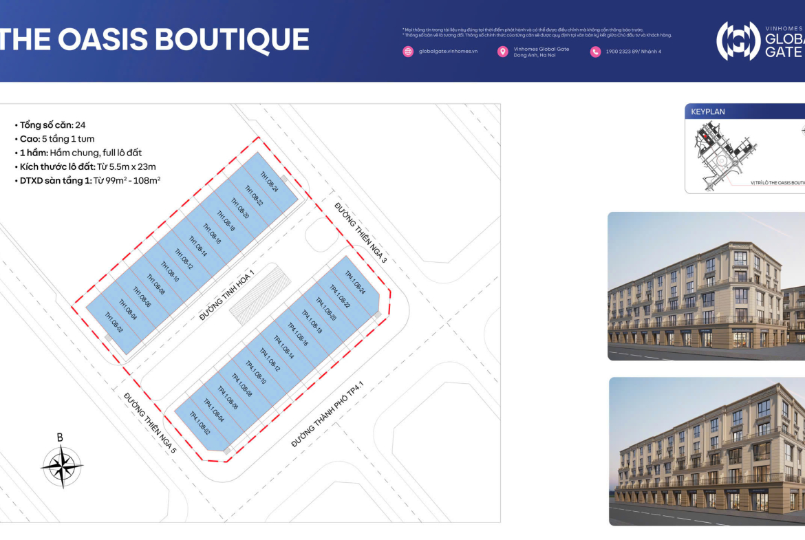 24 căn The Oasis Boutique khu Tinh hoa có 2 mặt đường, xây 5 tầng 1 tum, tầng hầm dùng chung, DT đất 5,5 x 23. DT xây dựng sàn Tầng 1 từ 99m2 – 108m2, hướng đông nam – tây bắc.
