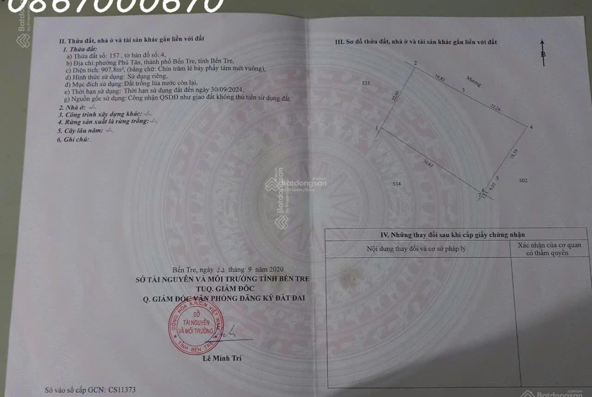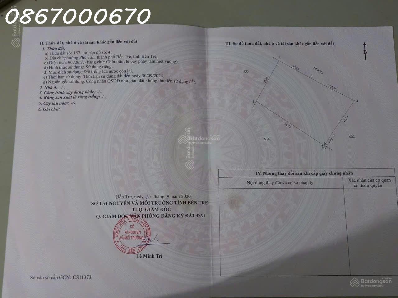 Cần tiền bán nhanh lô đất 907,8m2 tại Tường Đa, Châu Thành, Bến Tre, giá đầu tư