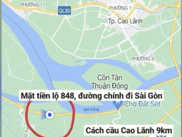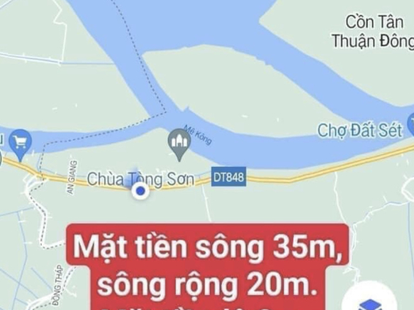 – Đất 2 mặt tiền, mặt tiền lộ 848 rộng 9m, lộ rộng 10m. Mặt tiền sau rộng 35m (nở hậu), lộ rộng 4m, có mặt tiền sông 35m, sông rộng 20m. Tổng chiều dài 100m
