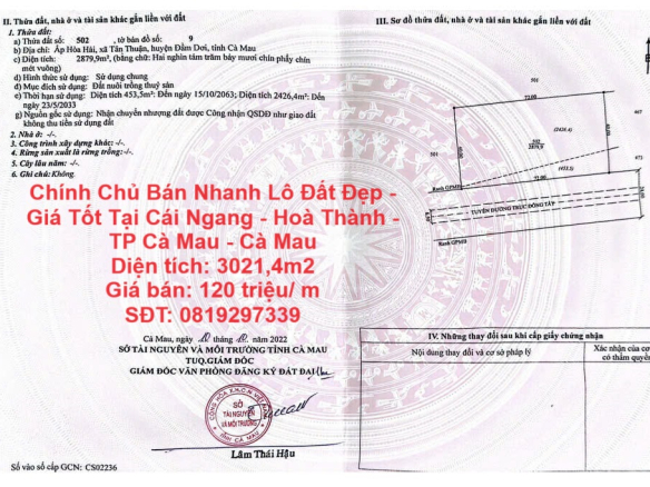 Chính Chủ Bán Nhanh Lô Đất Đẹp – Giá Tốt Tại Cái Ngang – Hoà Thành – TP Cà Mau – Cà Mau