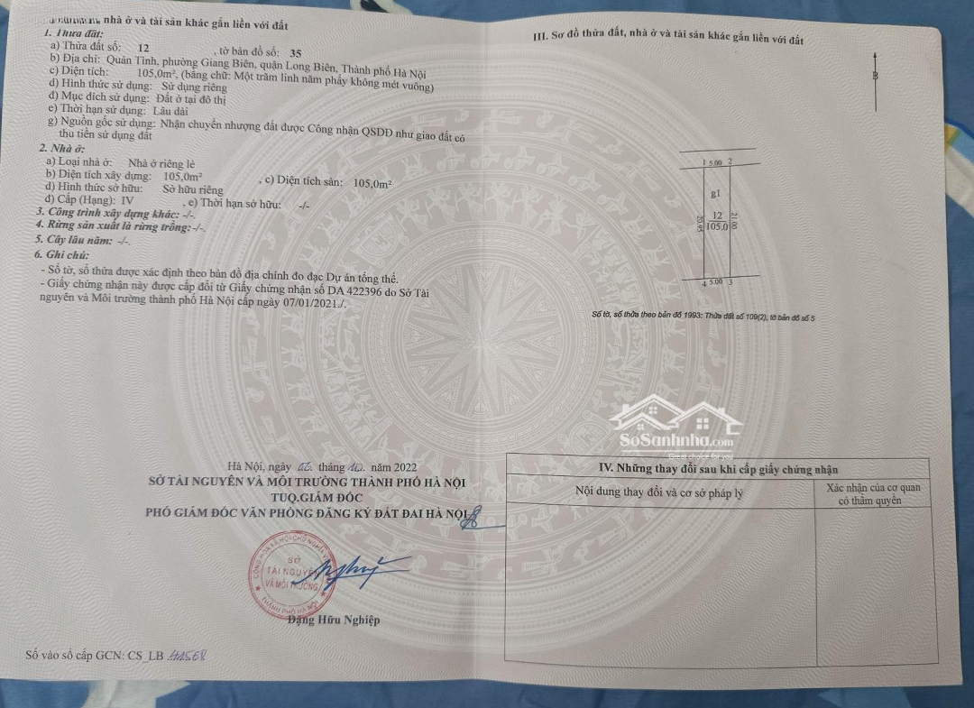 – Diện tích 105 m2 vuông vắn mặt tiền 5mx21m, ngõ thông bàn cờ, mặt ngõ 3m ô tô vào đất, 20m ra mặt đường.