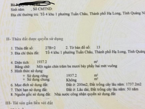 Chính chủ cần bán Đất Tổ 4 Khu 1 Phường Tuần Châu Thành Phố Hạ Long Tỉnh Quảng Ninh