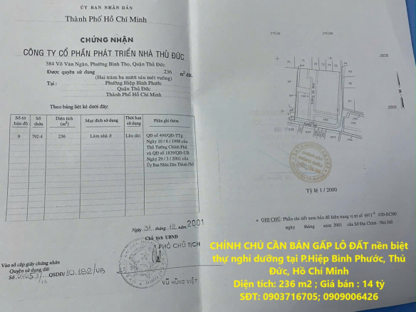 CHÍNH CHỦ CẦN BÁN GẤP LÔ ĐẤT nền biệt thự nghỉ dưỡng tại P.Hiệp Bình Phước, Thủ Đức, Hồ Chí Minh