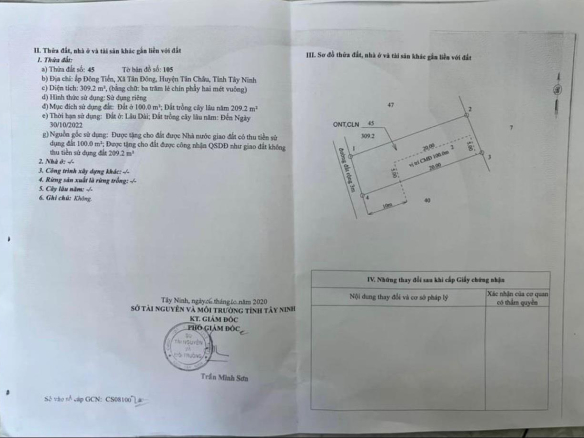 * Diện tích: 300m2 (ngang 10 dài 30 )có 100m thổ cư