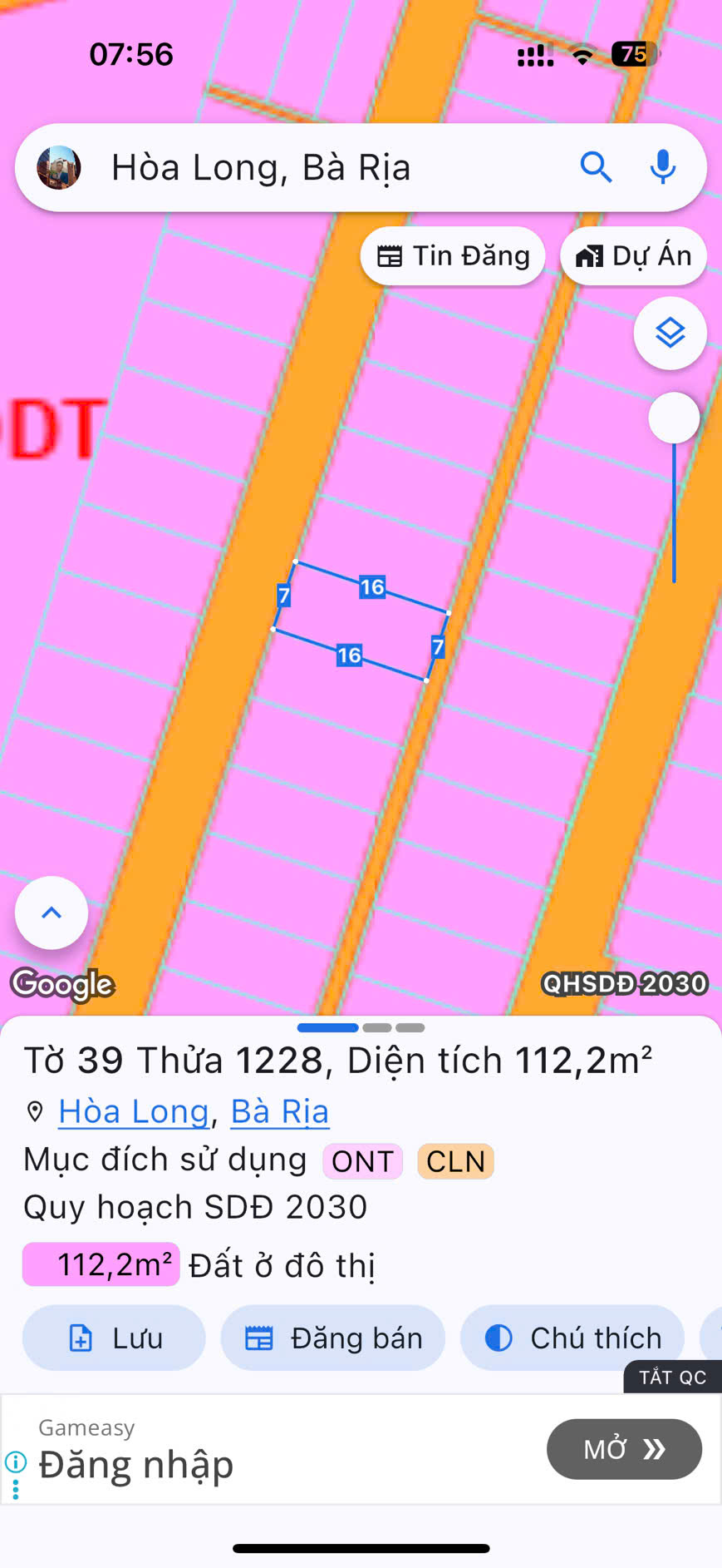 chính chủ cần bán lô đất đường số 3 Hoà Long. 112m2, 80 thổ cư, 7×16.
