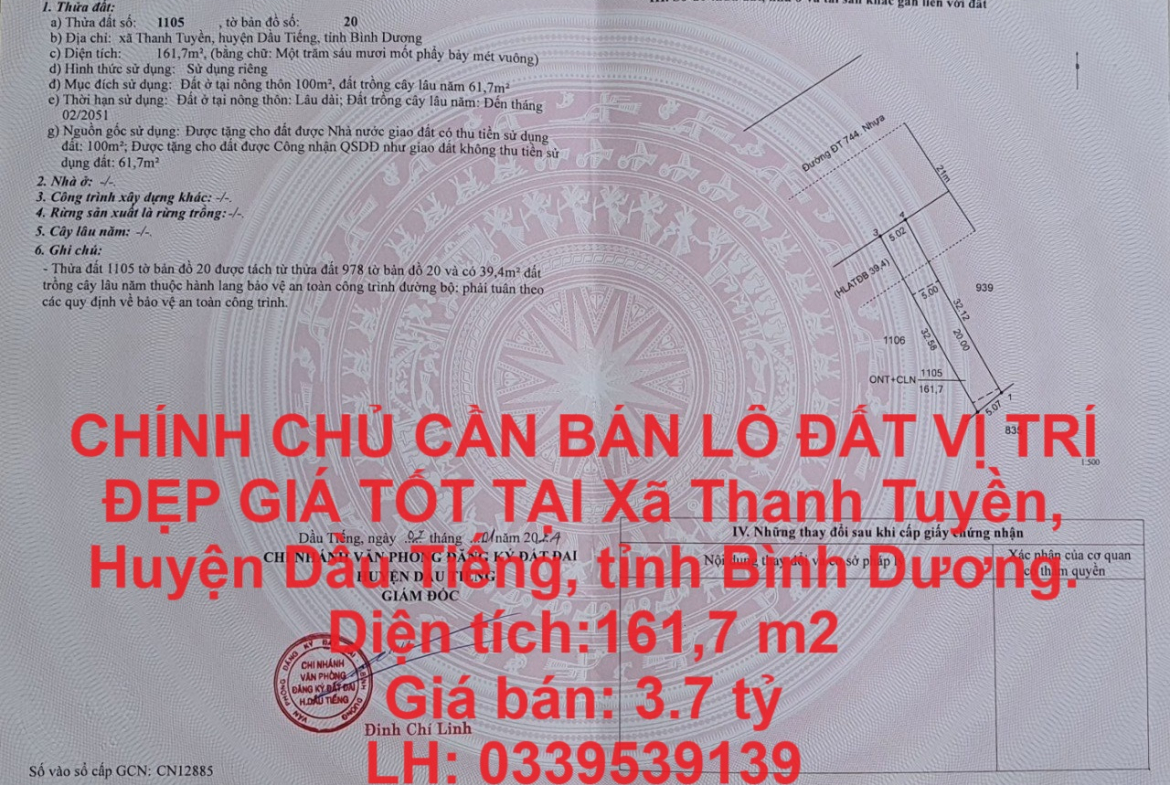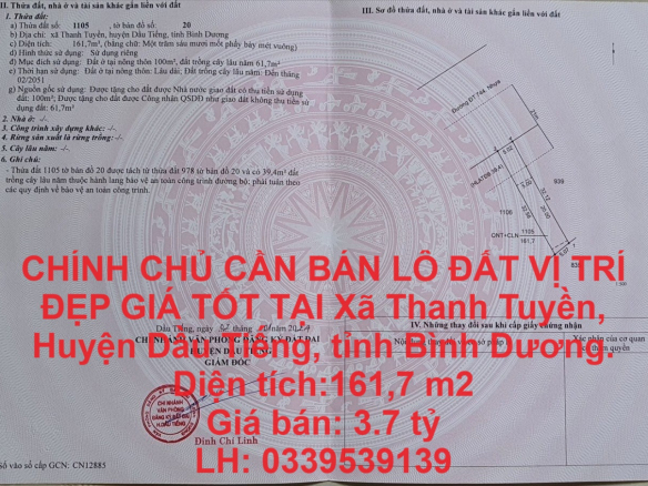 CHÍNH CHỦ CẦN BÁN LÔ ĐẤT VỊ TRÍ ĐẸP GIÁ TỐT TẠI Dầu Tiếng, Bình Dương .LH 0339539139