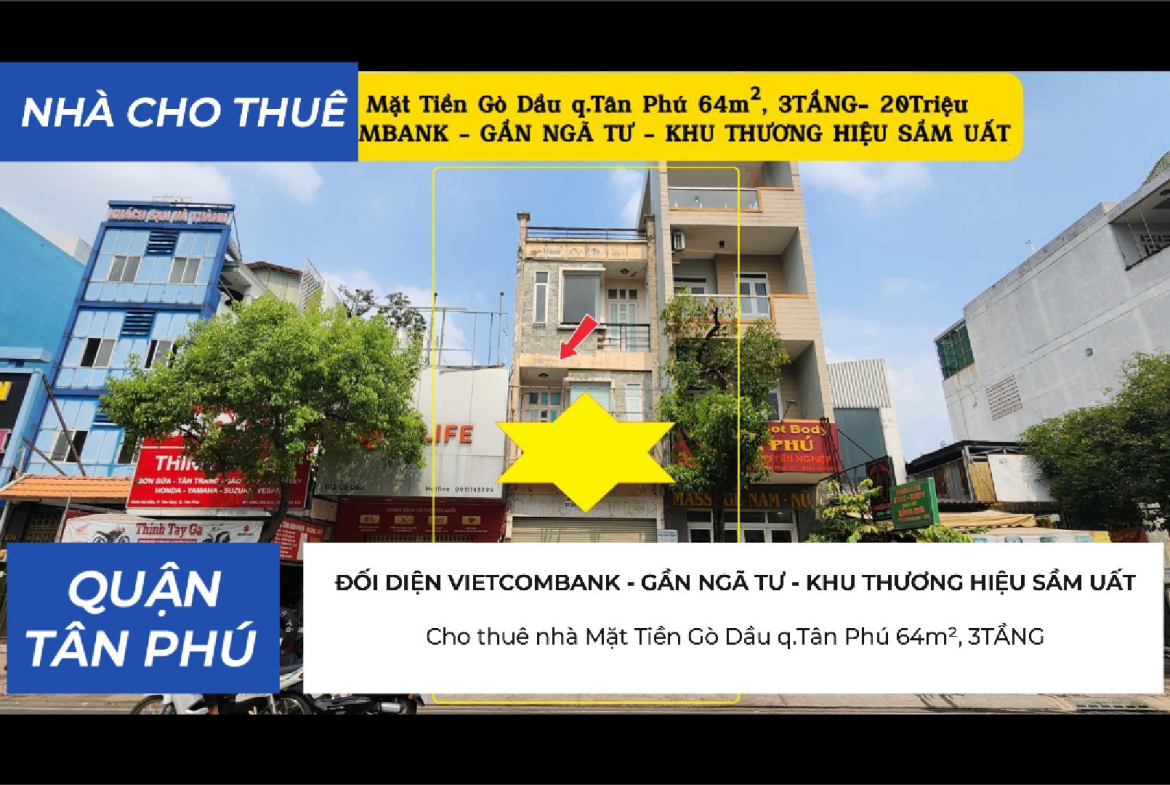 Cho thuê nhà Mặt Tiền Gò Dầu q.Tân Phú 64m², 3TẦNG- 20Triệu – CẠNH VIETCOMBANK