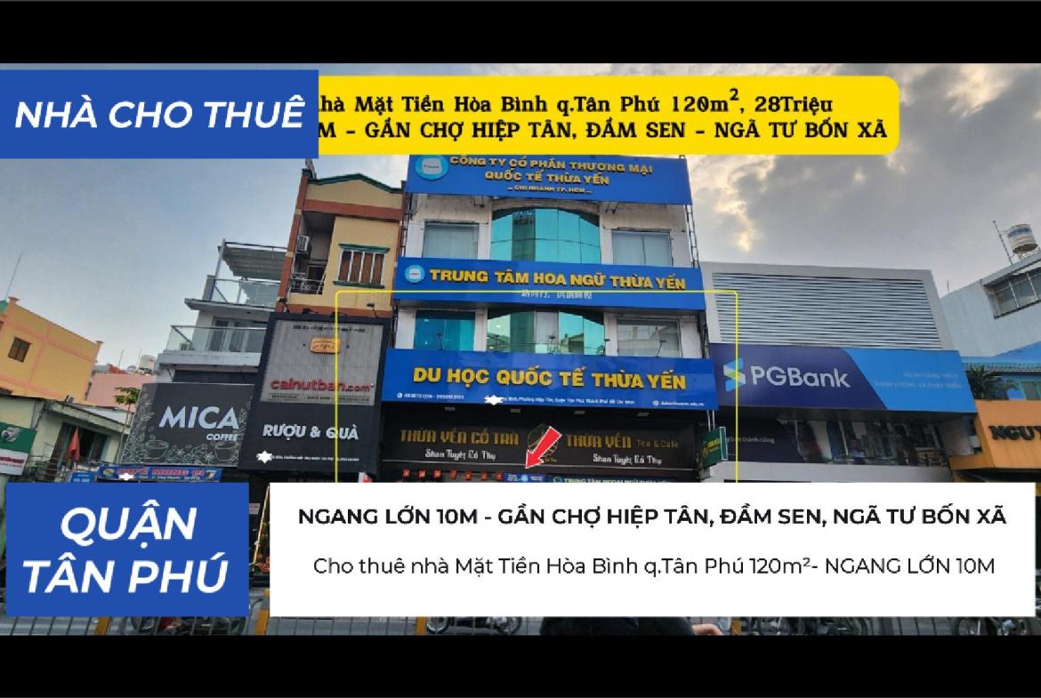 Cho thuê nhà Mặt Tiền Hòa Bình q.Tân Phú 120m²- NGANG 10M – 28Triệu – GẦN CHỢ