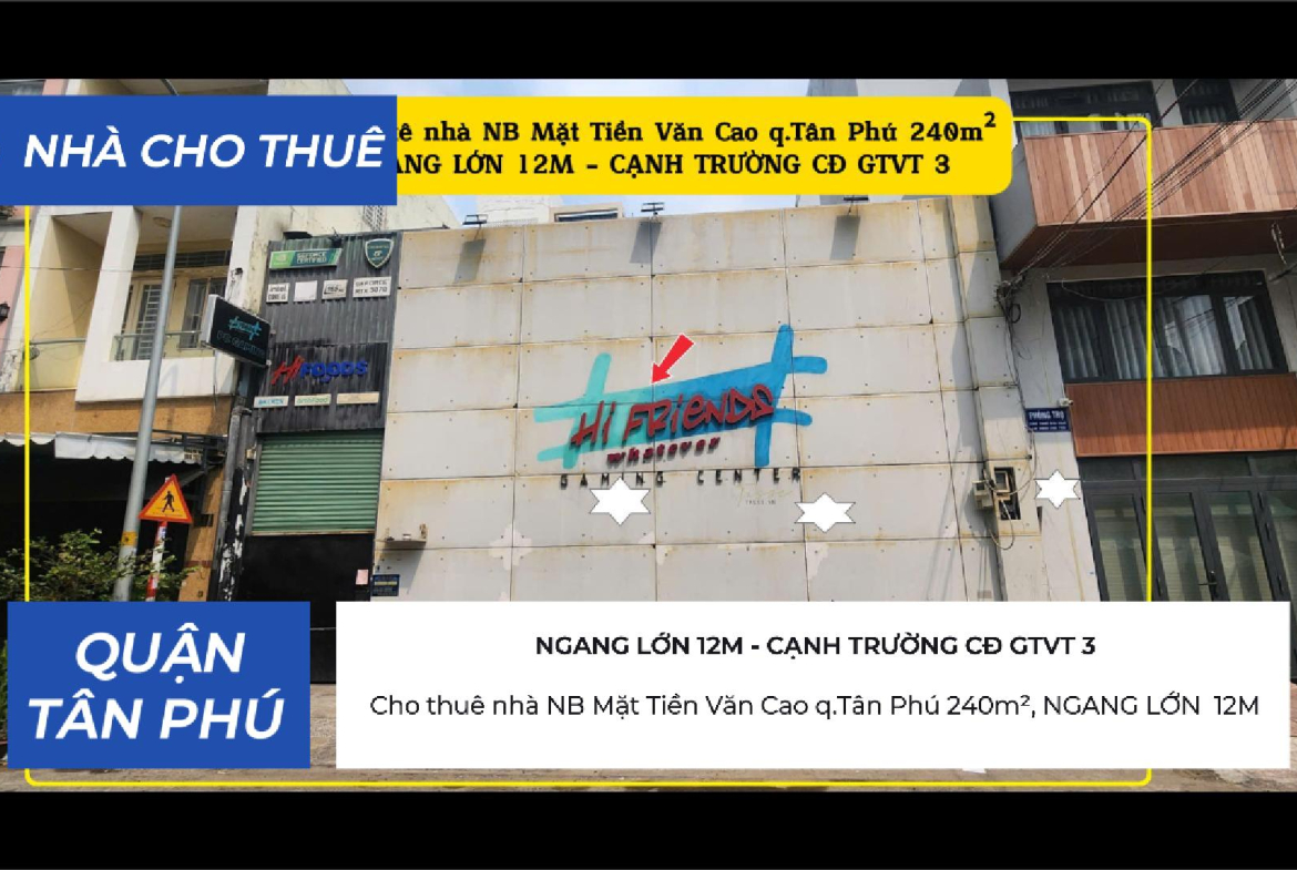 Cho thuê nhà NB Mặt Tiền Văn Cao q.Tân Phú 240m²,NGANG 12M – CẠNH TRƯỜNG CĐ GTVT 3