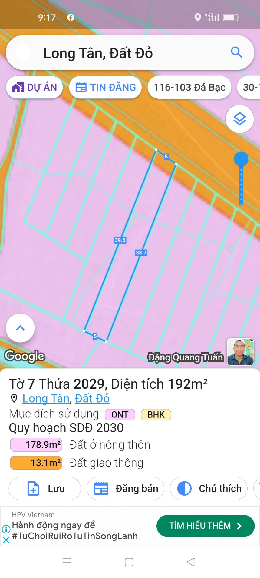 Chủ bán lô đát đẹp mặt tiền nhựa tim vàng , long tân ,huyện đất đỏ