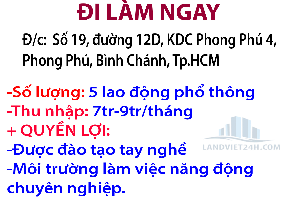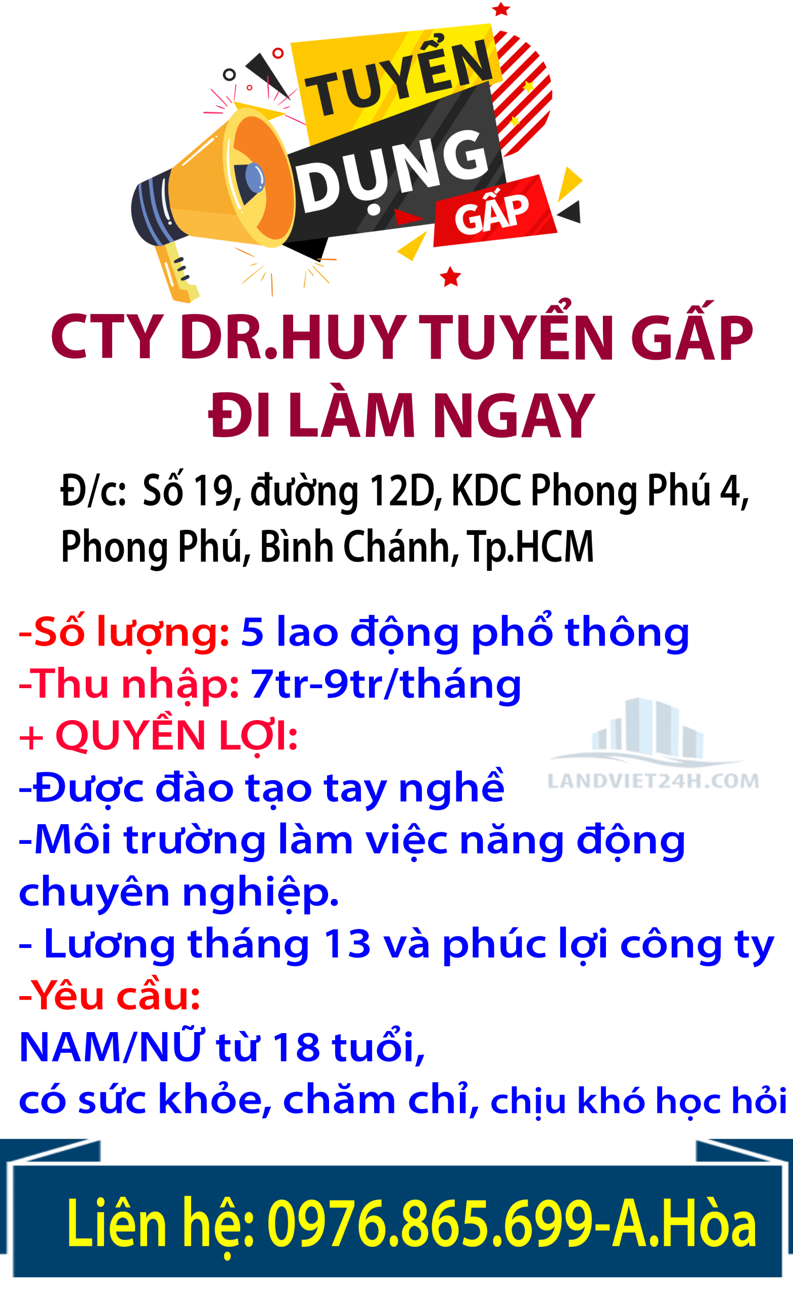 CTY DR.HUY TUYỂN GẤP- ĐI LÀM NGAY- 5 LAO ĐỘNG PHỔ THÔNG KHU VỰC XÃ PHONG PHÚ, BÌNH CHÁNH