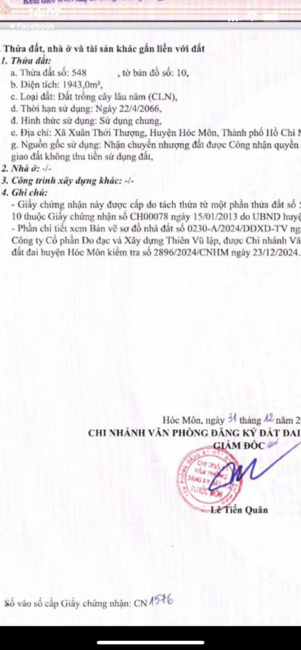 | Diện tích: 50 × 39 = 1.943m², trong đó 500m² thổ cư | ||||||