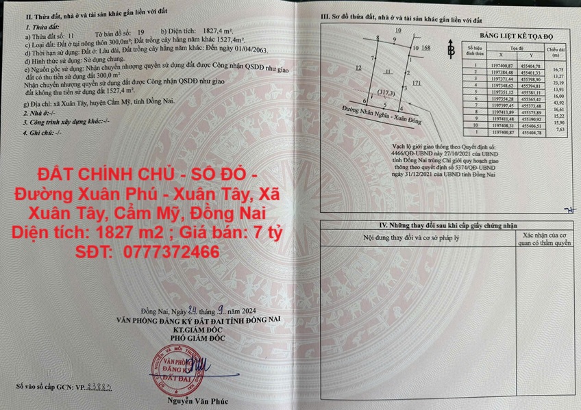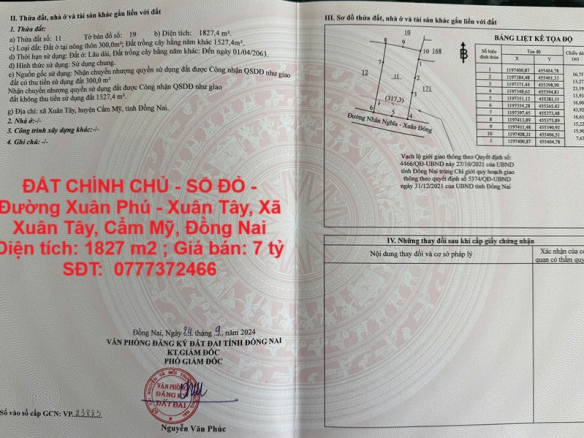 – Diện tích rộng lớn 1.827 m², 300 m² thổ cư. Quy hoạch full thổ.