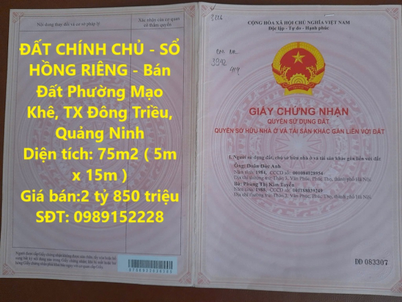ĐẤT CHÍNH CHỦ – SỔ HỒNG RIÊNG – Bán Đất Phường Mạo Khê, TX Đông Triều, Quảng Ninh