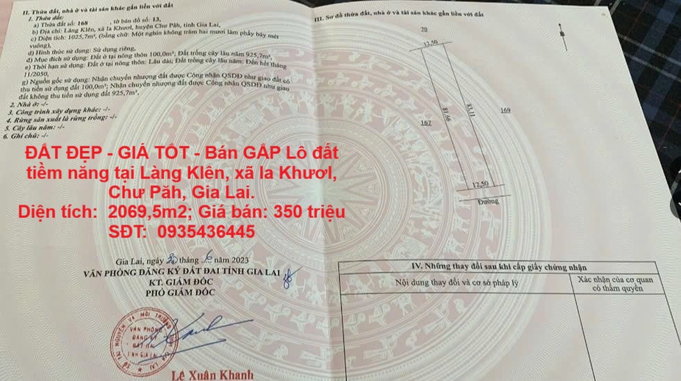 Diện tích:  2069,5m2 (ngang 25m x dài 84m), có 200m2 đất ở.