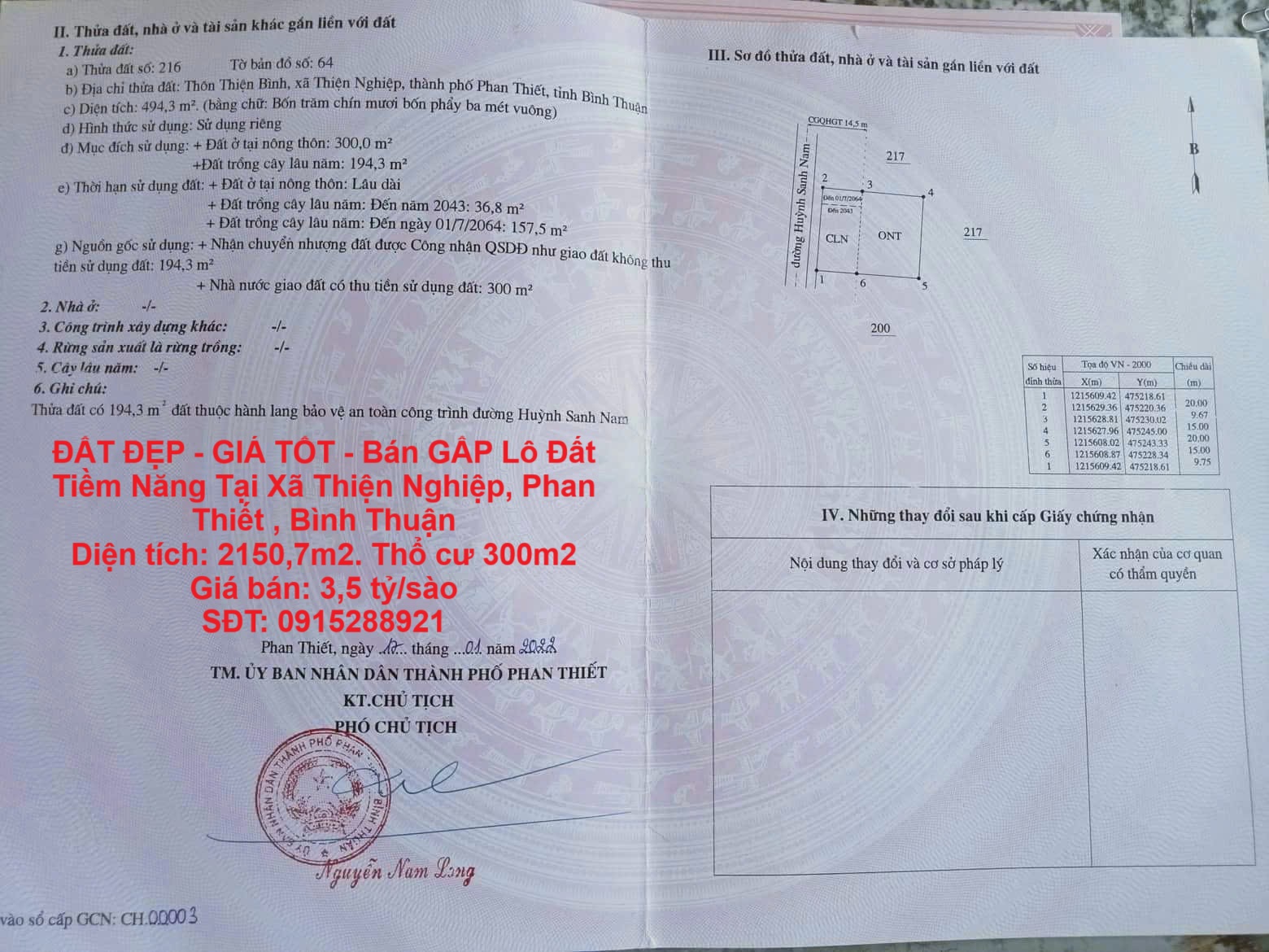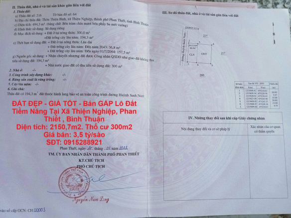 Diện tích: 2150,7m2. Thổ cư 300m2