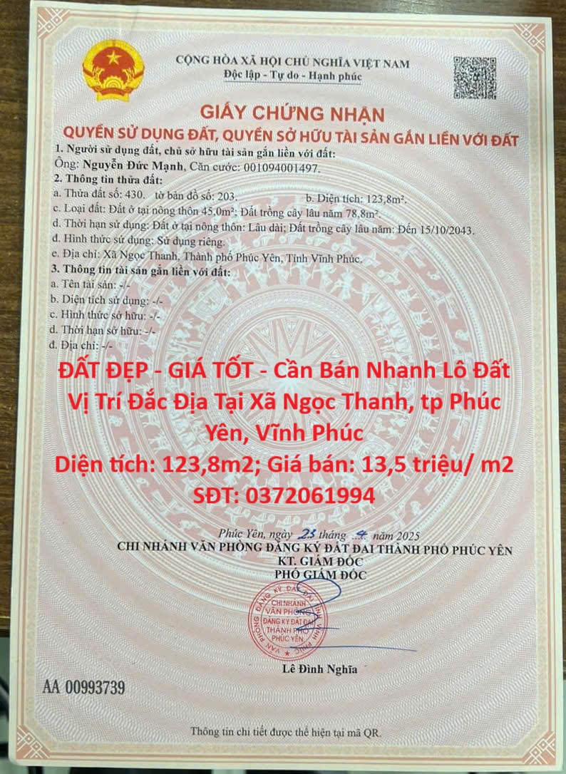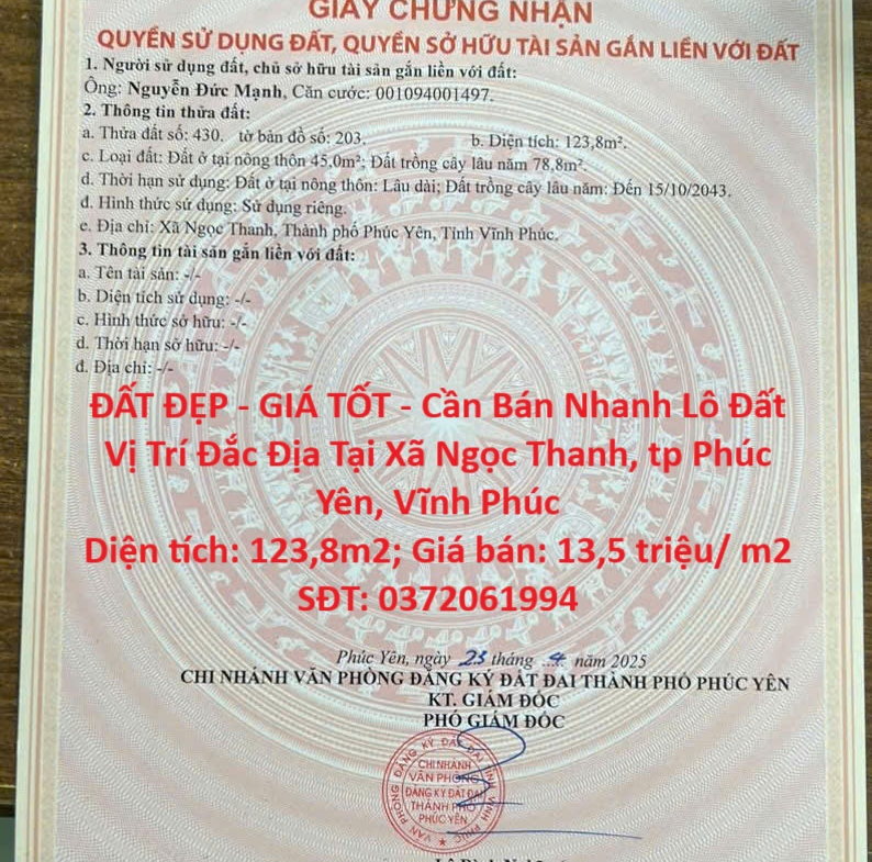ĐẤT ĐẸP – GIÁ TỐT – Cần Bán Nhanh Lô Đất Vị Trí Đắc Địa Tại Xã Ngọc Thanh, tp Phúc Yên, Vĩnh Phúc