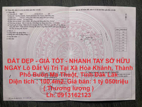 Diện tích : 100,4m2. Trong đó 60m2 đất thổ cư , đất trồng cây lâu năm 40,4m2